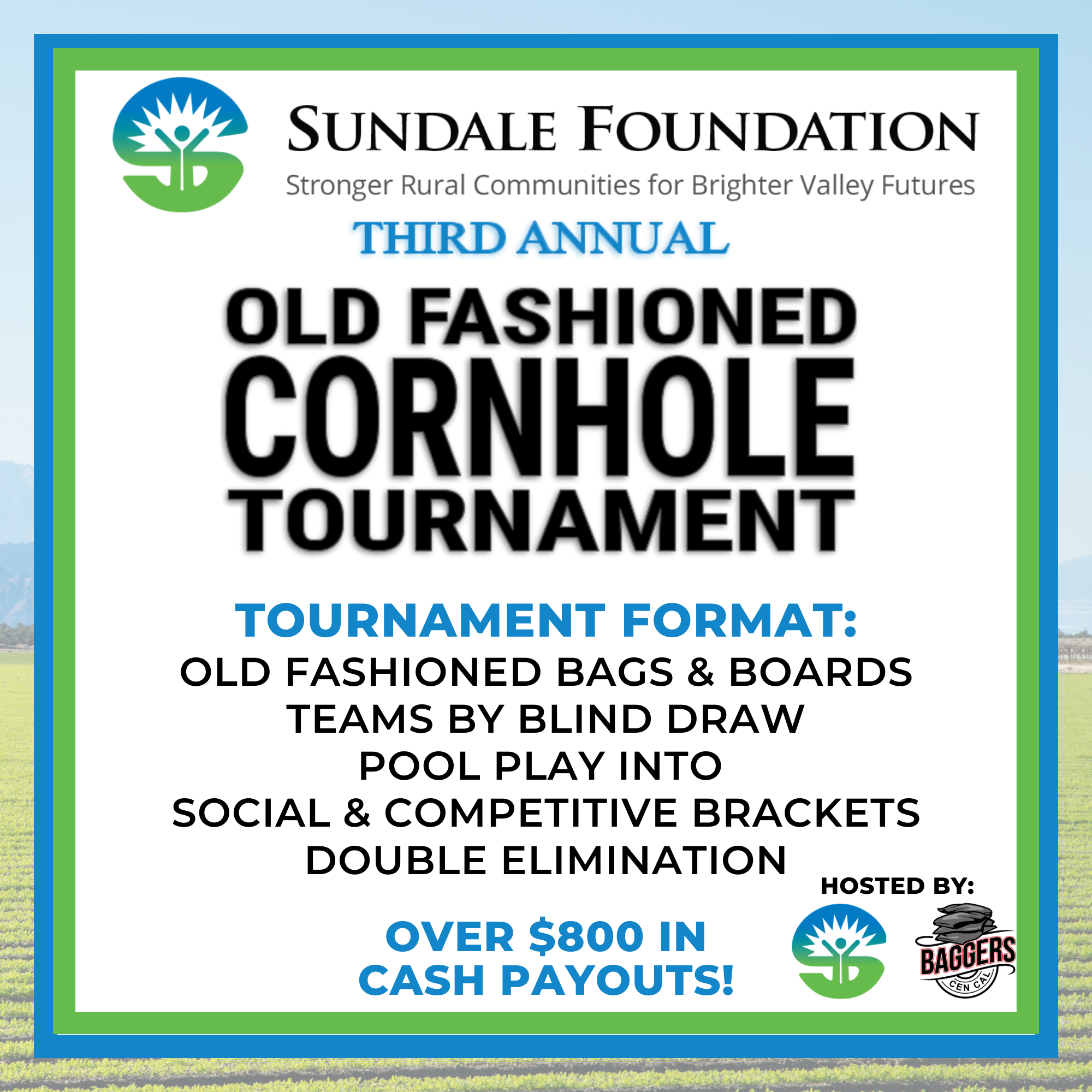 This is for the Entry Fee to the 2022 Corn Hole Tournament.  Hosted by the Sundale Foundation and the Cen Cal Baggers, with all proceeds going towards the Sundale Foundation.